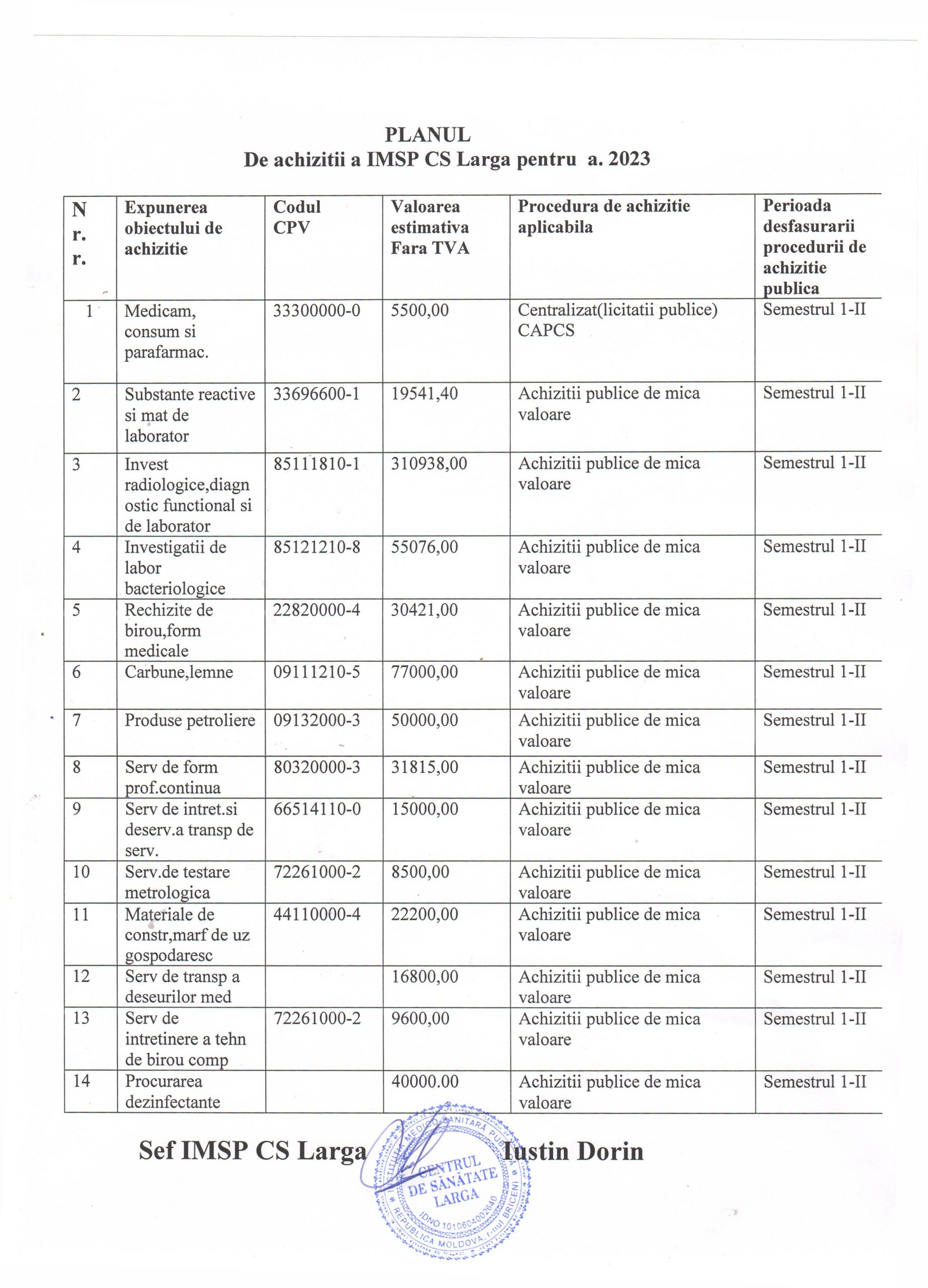 Achiziții publice Plan-achizitii-2020Descarcă Procurari-dezinfmedic2020-nr1Descarcă Procurari dezinf,medic2020 nr2Descarcă Procurari-2022Descarcă Plan achizitii 2023Descarcă